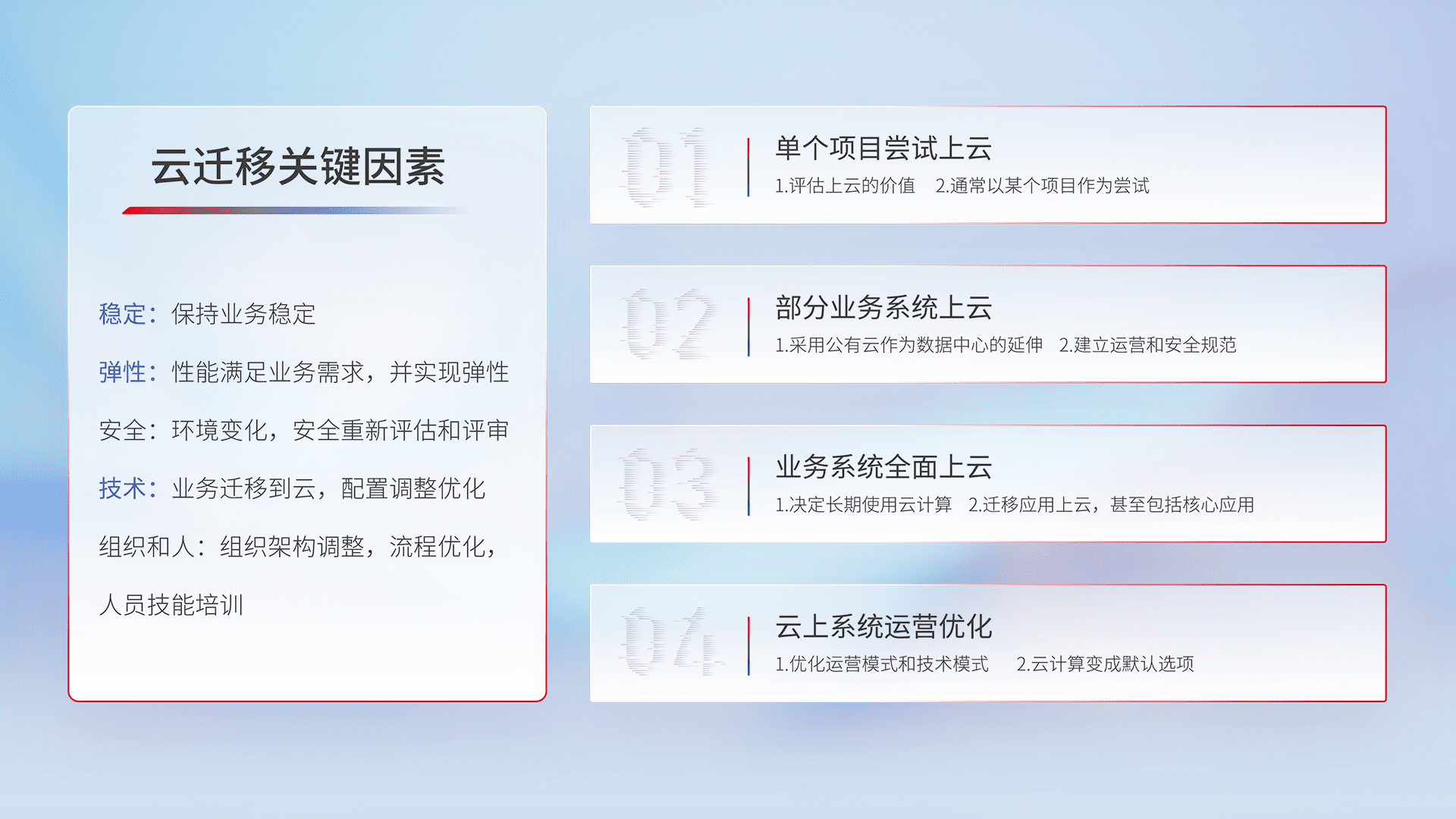 结合实际业务,,,,从规划设计、、、、云平台选型、、云原生改造、、、、数据迁移、、、、集成交付,,迁移全过程为客户识别最佳上云路径,,,做好风险识别管理,,,设计网络架构、、身份权限、、安全审计合规、、、操作审计、、、日志审计、、、监控告警策略、、多站点容灾设计等,,,对云上基础设施进行整体规划,,,提升IT治理水平,,,以满足弹性、、、高可用、、、高性能的需求。。。
