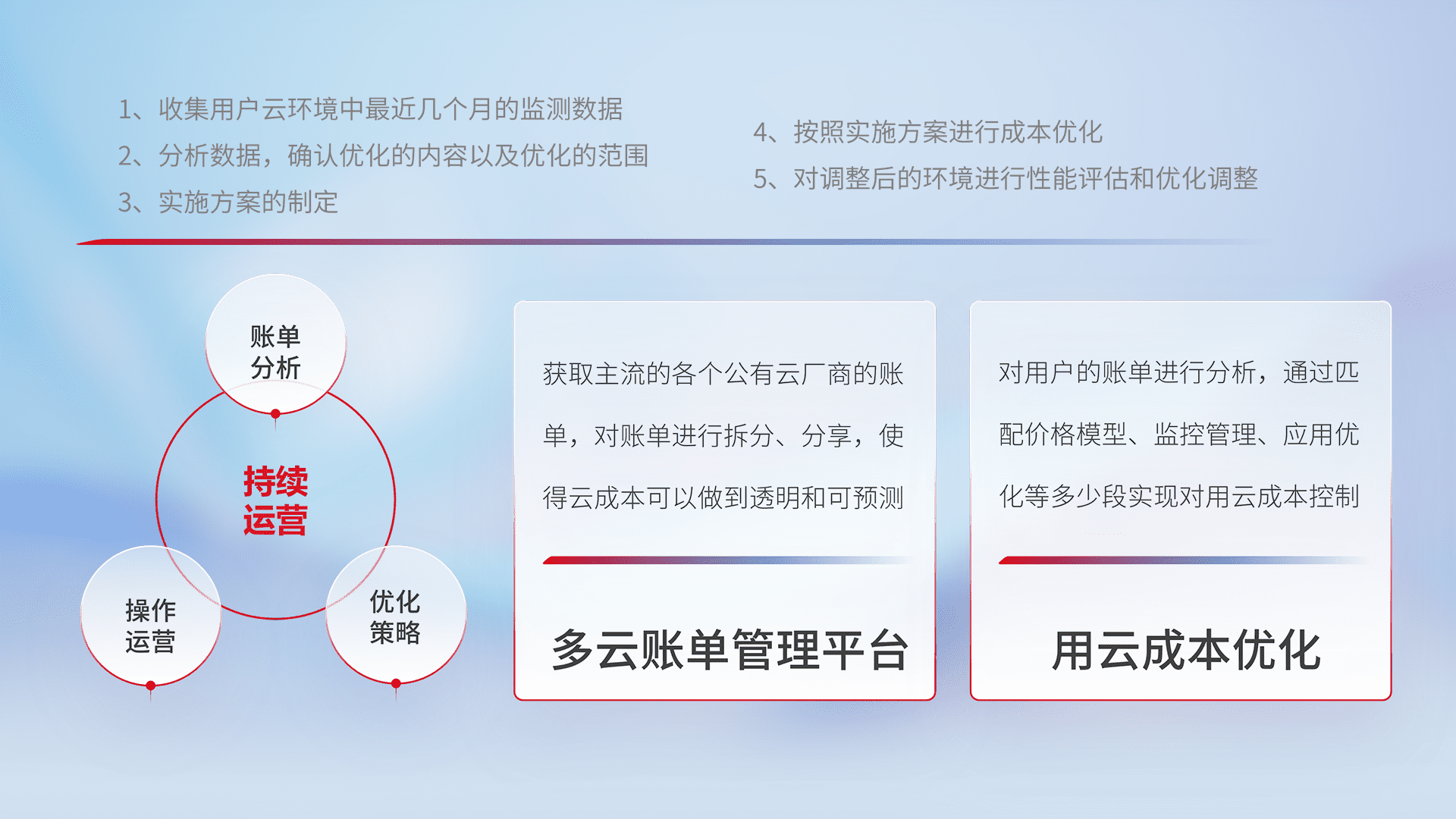 通过多云纳管,,,以统一的资源数据模型把客户的云资源进行抽象和封装,,,,进而实现对多云资源的统一操作,,,保障云资源管理的可靠性、、稳定性与可用性。。量身定制化运维内容,,,,配置、、、、开发运维、、补丁管理、、、备份、、监控、、认证和访问管理、、、、审计和日常巡检等,,保障在用云过程中的可靠度,,,稳定度以及高可用率。。。。